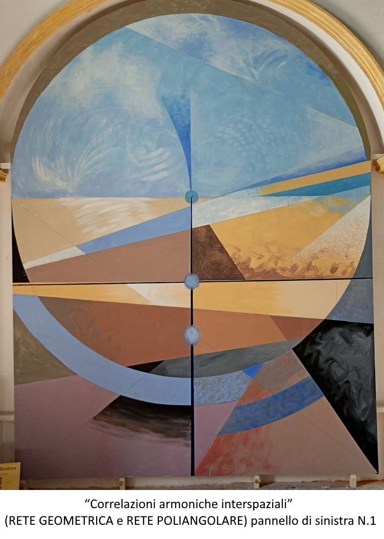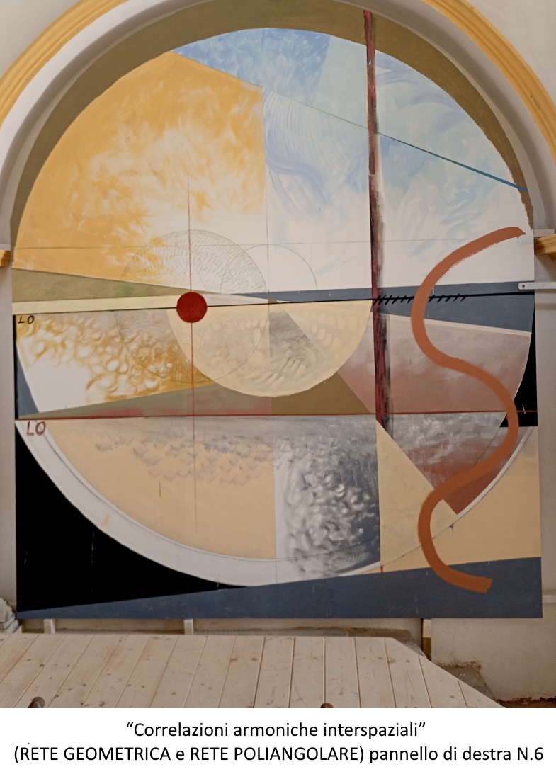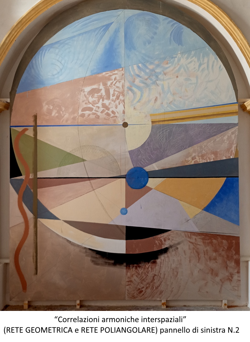 In questa prima fase, che potremmo tecnicamente definire di “correlazioni armoniche interspaziali“ e che abbiamo lasciato parzialmente in evidenza, si sono studiate le due direttrici basilari che hanno determinato la struttura compositiva di ciascuna pittura murale: