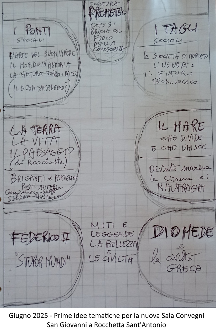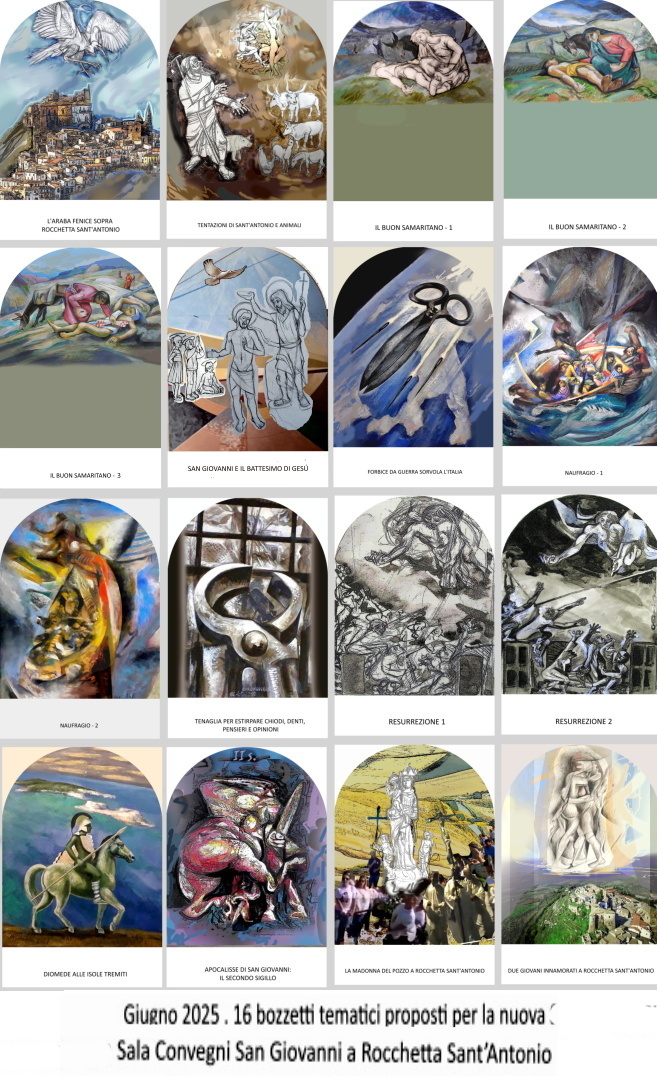 Il nostro intervento di pittura murale nella nuova sala convegni della chiesa di Rocchetta Sant’Antonio investe una superficie totale di circa 80 metri quadrati e i sei dipinti che compongono il complesso pittorico monumentale, sono stati realizzati con pittura acrílica su supporti mobili in legno multistrato, collocati a dieci centimetri di distanza dalle pareti, nel rispetto piú assoluto delle norme dettate dalla Soprintendenza ai Beni Culturali per gli edificidi valore storico, artistico e architettonico.