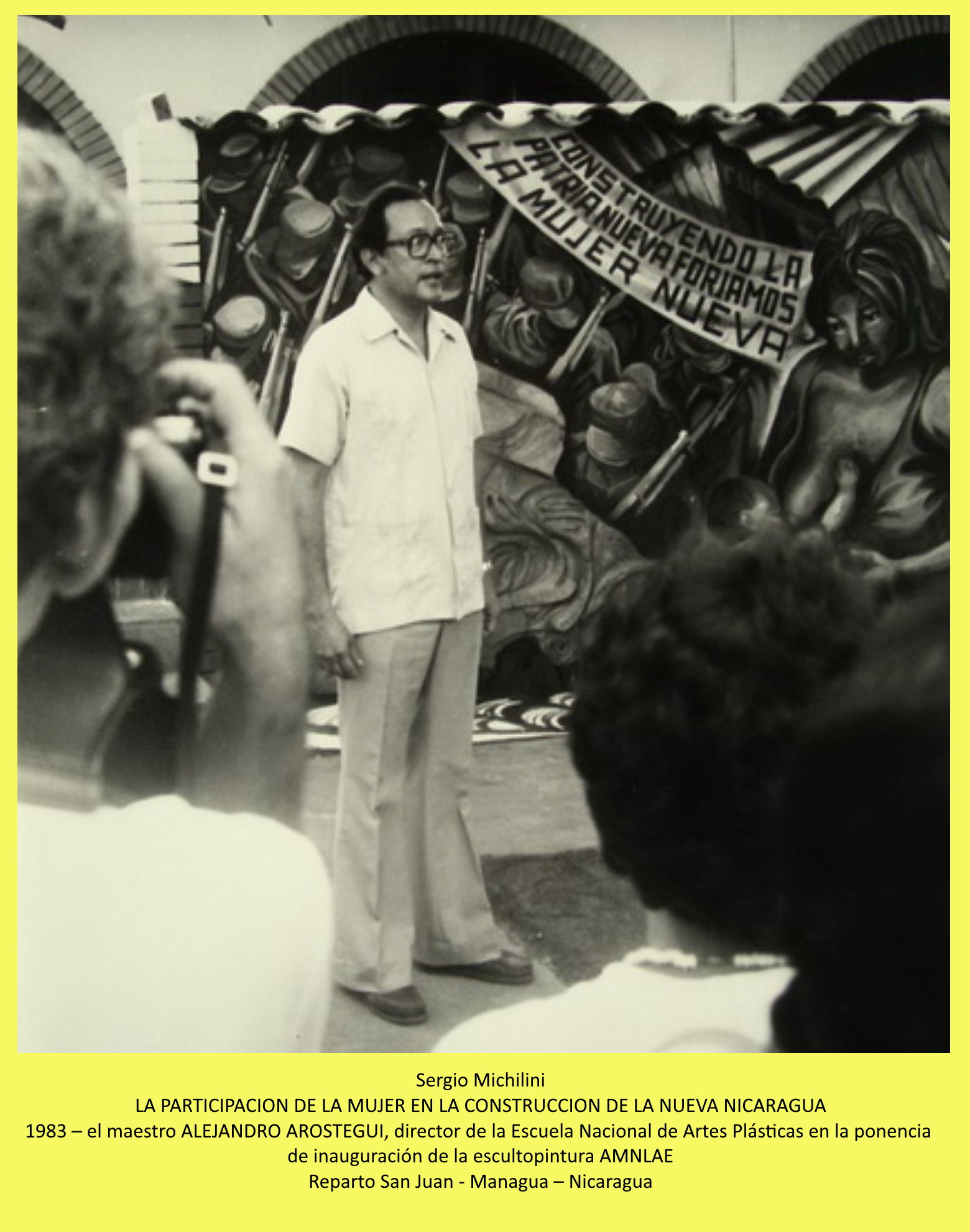 En Agosto 1983 el maestro ALEJANDRO AROSTEGUI, Director de la Escuela Nacional de Artes Plásticas inaugura la esculto-pintura mural de la Casa Nacional AMNLAE en Managua, Nicaragua, resaltando los novedosos valores plásticos expresivos del mural y lo valioso del método didáctico de trabajo en equipo.