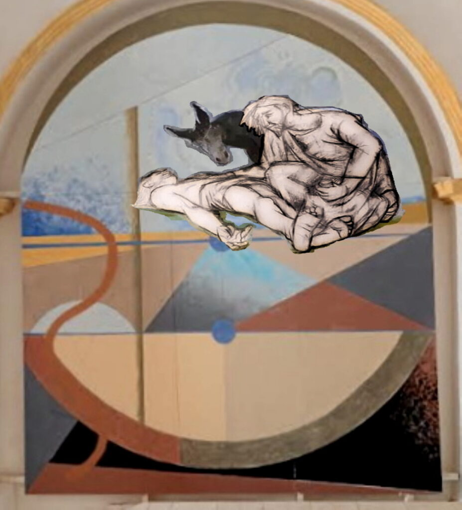 Ho dipinto il “Il Buon Samaritano”, che è una parabola di Gesù, narrata nel Vangelo secondo Luca 10,25-37, quando giá avevamo chiarito che il pannello di fronte sarebbe stato dedicato all’INDIFFERENTE, cioé alla attualizzazione del messaggio evangelico ai giorni nostri.
