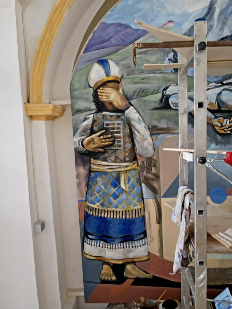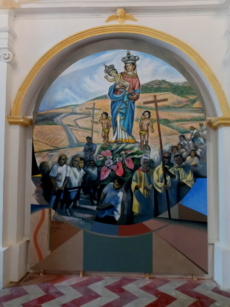 Dopo il Sant’Antonio ho preferito lavorare direttamente al terzo pannello di sinistra, che avevo giá chiaramente dipinto con il pensiero e, in parte pure con pennelli e colori, realizzando alcuni bozzetti e un dipinto ad olio per un affresco in una chiesa di Lucera, che non si é potuto ancora concretizzare.