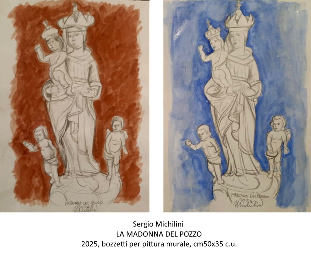 Molto probabilmente la statua della Madonna del Pozzo avrebbe avuto un impatto visivo ed espressivo maggiore con una soluzione come quella del bozzetto approvato: la figura totalmente bianca con solamente delineato il disegno, come un lavoro “in progress”, un “non- finito” contemporaneo che, tra l’altro poteva anche rappresentare al meglio il senso immateriale e trascendentale della devozione mariana.