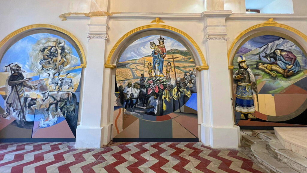 In questo modo ho iniziato lavorando al primo pannello, quello dedicato al Sant’Antonio Abate che, con questo proposito iniziale considero il piú riuscito e addirittura (cosa che succede raramente), la pittura murale risulta essere piú potente e plasticamente eloquente del bozzetto approvato, che é la “prima emozione” del tema stabilito..