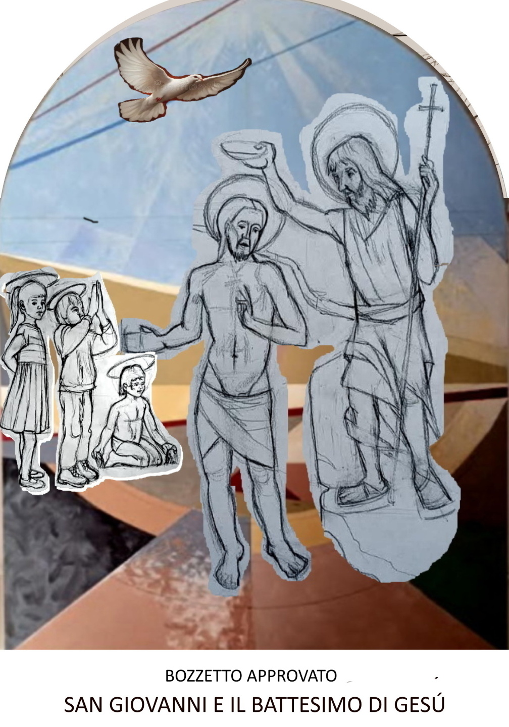La rappresentazione luminosa di Gesú e Giovanni si staglia sulla luminositá del cielo “squarciato” per la discesa della colomba: é una scena di luce in controluce che sono riuscito a realizzare approfittando della linea obliqua strutturale sul fondo, come una lacerazione chirurgica netta e decisa che divide la serenitá metafisica del cielo azzurro, la pace, l’armonia e l’equilibrio dall’agitazione, inquietudine e ansia delle nuvole scure all’orizzonte.
