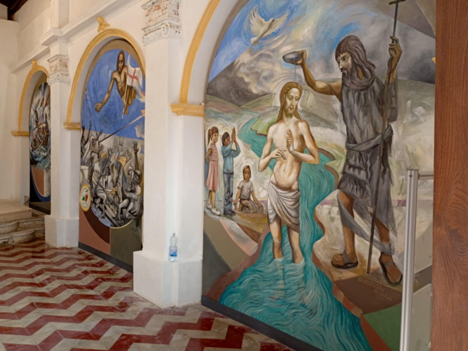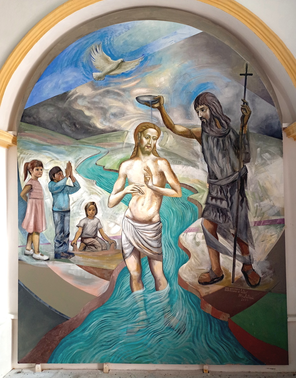 Dopo le riflessioni sulle prime tre pitture murali corrispondenti al lato sinistro della navata unica della chiesa di San Giovanni osserviamo ora tra le pitture murali sulla destra della navata, questa del SAN GIOVANNI E IL BATTESIMO DI GESÚ.
