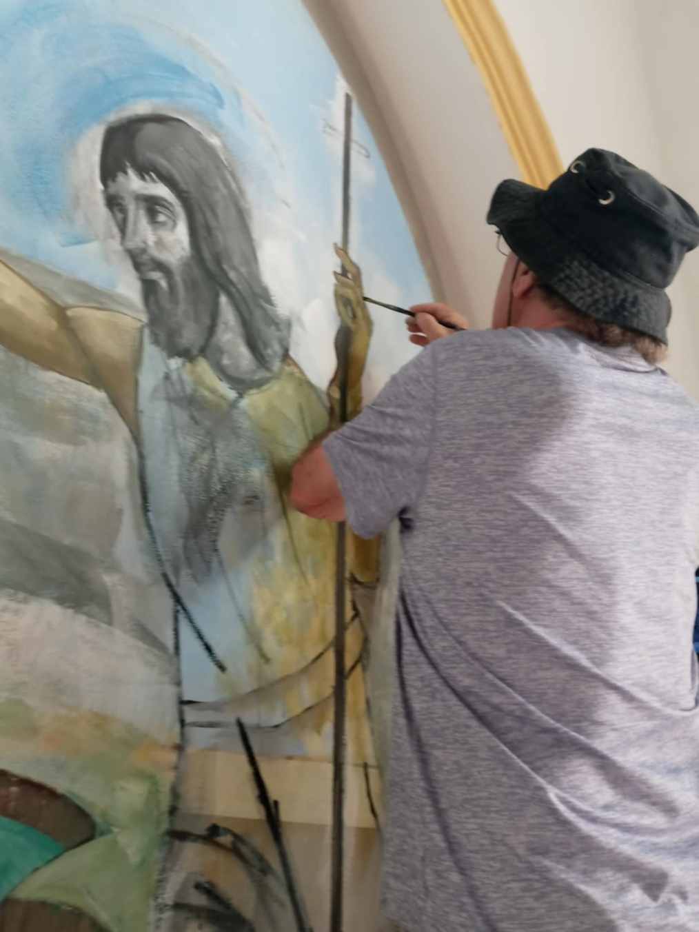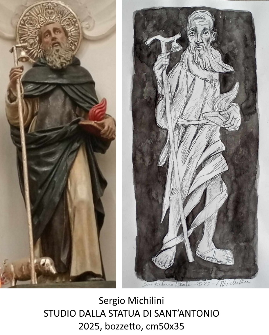 Ho rivisto lo studio sul Sant’Antonio Abate della Chiesa Madre di Rocchetta che avevo fatto da poco e l’ho modificato leggermente per caratterizzare il San Giovanni, come uomo dalla intensa spitritualitá e ovviamente magrissimo, logoro e consunto, mentre Gesú é rappresentato trentenne all’inizio della sua vita pubblica, dopo gli anni di adolescenza e giovinezza trascorsi a Nazaret.
