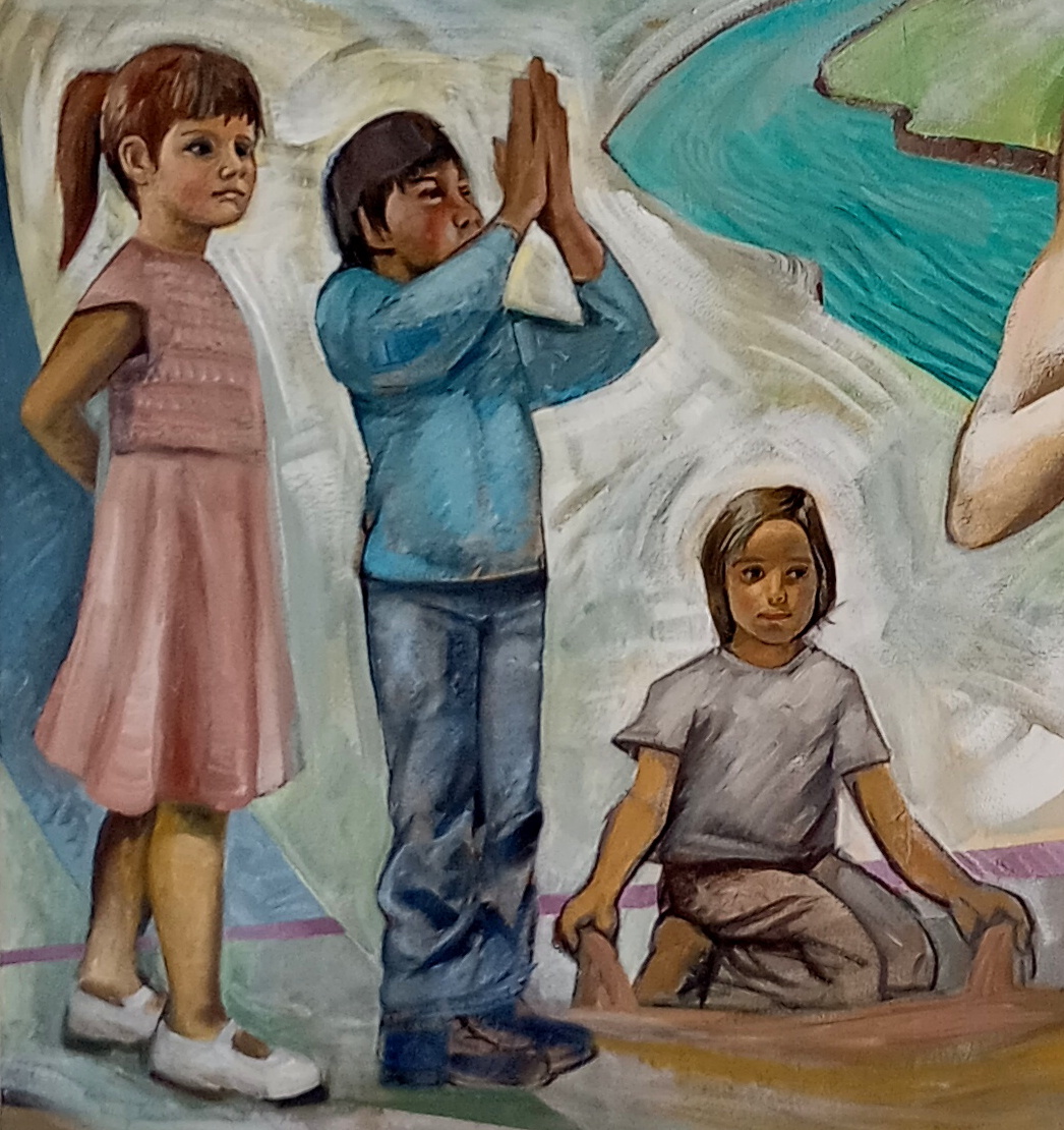 Nella iconografia tradizionale vengono spesso rappresentati tre angeli “per sottolineare la valenza trinitaria del battesimo” ma anche simboleggiando le virtù teologali, la pace e la concordia. Attualizzando questo tema iconografico abbiamo pensato che i migliori rappresentanti delle “virtù teologali, la pace e la concordia” del giorno d’oggi in qualitá di angioletti non potevano che essere tre bambini di diverse nazionalitá, a sottolineare i maltrattamenti, gli abusi e le violenze all’infanzia nell’ opprimente, pesante e soffocante mondo attuale.