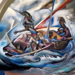 La terza e ultima pittura murale sulla destra della navata é intitolata “IL NAUFRAGIO E L’INDIFFERENTE” ed é l’unica del Ciclo Pittorico-Monumentale nella chiesa di San Giovanni a Rocchetta Sant’Antonio che risulta essere apparentemente laica e autonoma rispetto agli altri 5 temi di Arte Sacra rappresentati.